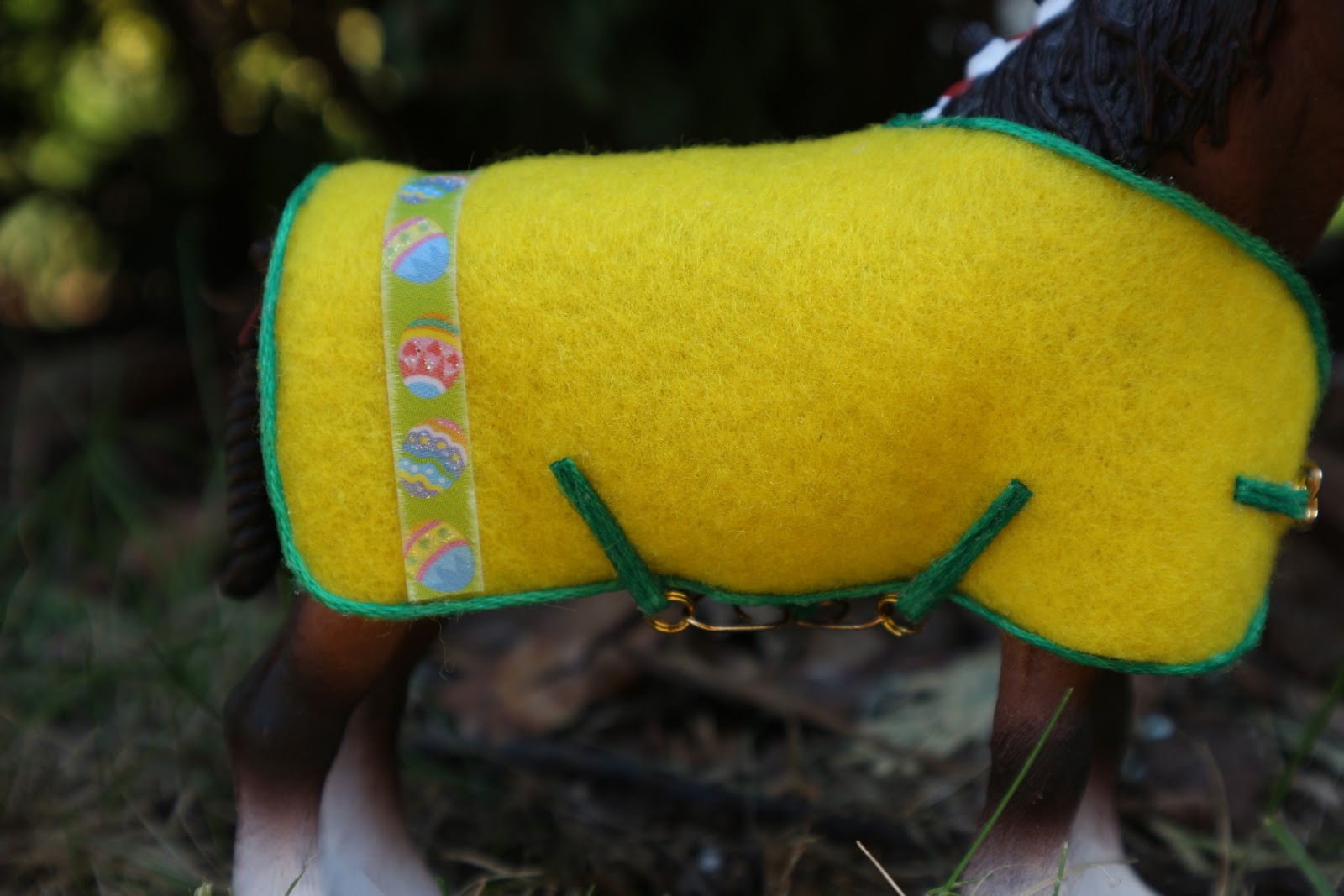 Derka jest wykonana z zielonego filcu, lamówka i paski od zapięć są z żółtej muliny, a na tyle widzimy ozdobną wstążkę.